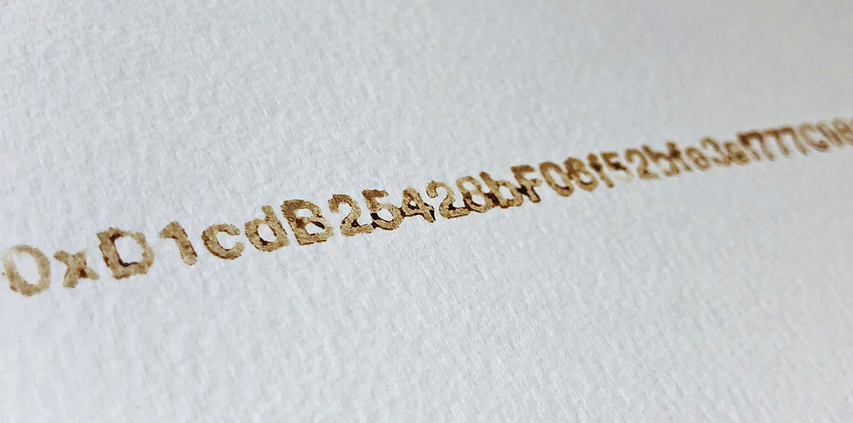 The physical works are stamped using the artist's own blood, with the contract address on the Ethereum blockchain corresponding to the creation of the the 10 million virtual works. The virtual works are standard ERC-20 tokens and token owners are free to share these artworks and even divide them into smaller pieces before sharing.